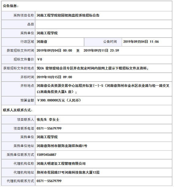 河南工程學院校園視頻監控系統招標公告