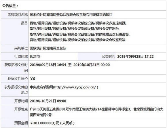 采購項目名稱: 國家統計局湖南調查總隊視頻會議系統專用設備采購項目