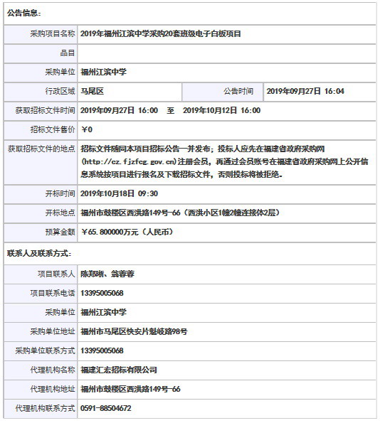 采購項目名稱: 2019年福州江濱中學采購20套班級電子白板項目