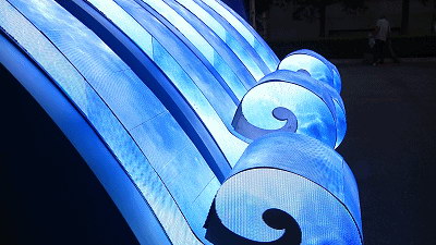 “湖北彩車”車頭以三峽大壩為造型,壩前的五朵浪花,由美亞迪戶外P3柔性異形顯示屏完美呈現。三面異形屏無縫拼接,從畫板到定型本身就是一個挑戰,多款異形屏加大了設計難度,對制作生產工藝要求也很高,同時兼具防水防震和前維護的技術要求。