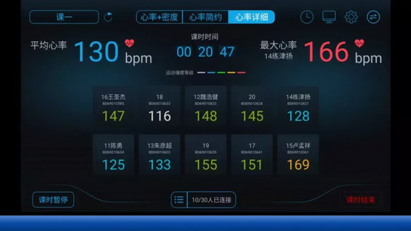 現場,參與課程的師生通過佩戴智能手環,與yCat無線便攜錄播建立了數據的連接。在直播的同時,yCat能夠實時監控學生運動時的運動心率和密度,以多維度的大數據分析,來幫助老師進行體育的科學性指導。