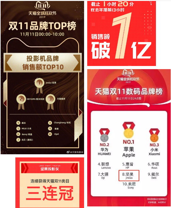 截止2019年11月11日23點59分,堅果投影儀狂攬6項冠軍,遠超同行,穩居第一!