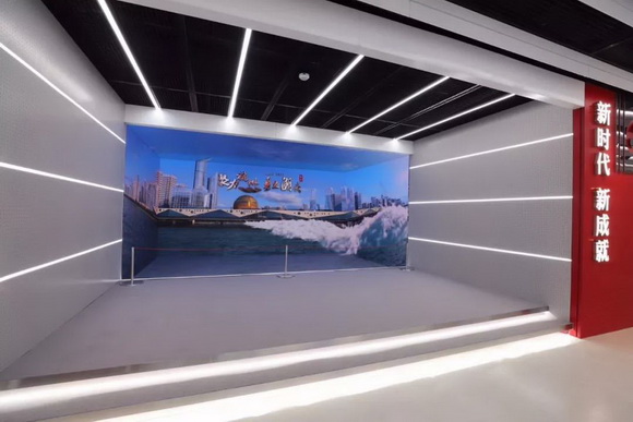 步入綜合服務(wù)中心大廳,一整塊巨幅LED屏吸引大家眼球,8K的顯示畫面栩栩如生,這塊LED創(chuàng)意顯示屏是中心理念的傳遞窗口,“新時代、新成就”等專題展示區(qū),通過“圖說”、“視聽”等生動的展示方式向參觀者傳遞著杭州黨群建設(shè)成果。