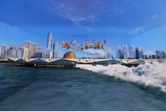 展廳另一側(cè)的三面立體魔方屏,結(jié)合現(xiàn)代美學(xué)的心理需求,打破了傳統(tǒng)平面LED屏的顯示效果,呈現(xiàn)出裸眼3D的震撼效果,搭乘杭州市高清景觀畫面,仿佛打開穿越歷史之窗,親身體驗了杭州百年演變。