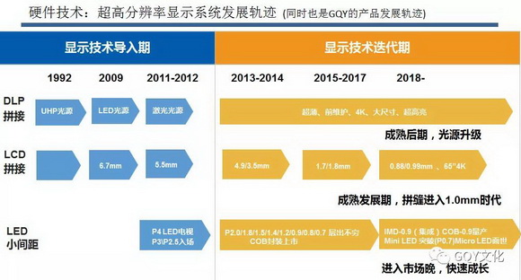 從顯示技術上看,DLP、LCD、小間距LED各自都有各自技術的創新,如DLP從開始的UHP光源,發展到最新的三色激光光源,LCD的拼縫從開始的5.5mm發展到現在的小于1mm;小間距LED從單色發展到全彩,點間距從2.5mm發展到0.6mm,并發展出MiniLED、OLED、(TOP)COB、共陰、倒裝工藝及柔性屏、異形屏、透明屏等各種類別產品。