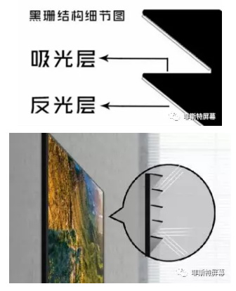 先來說說黑柵幕。在黑柵幕的表面,橫向上布滿了細小的棱鏡結(jié)構(gòu),主要作用是:吸收不反射來自屏幕上方的光線,主要反射來自屏幕下方的光線來抗環(huán)境光。不過,黑柵幕的橫向結(jié)構(gòu)只能抵擋來自屏幕上方的光線,如果屏幕兩側(cè)和正面有光源照射屏幕的話,黑柵幕的抗光效果會大打折扣。當然,如果是夜晚開頂燈觀看有較好的效果。