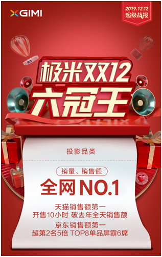 2019年雙12收官,極米科技再創(chuàng)佳績,全網銷量、銷售額均位居第一,實現(xiàn)雙12六連冠。其中極米在天貓銷售額第一,開售10小時破去年全天銷售額;同時京東銷售額超越第2名5倍穩(wěn)居第一,TOP8單品中極米獨占6席。