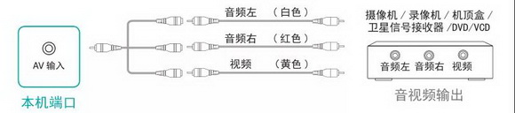 音視頻輸入接口需要接入一條三色線,由紅、白、黃三種顏色組成,其中黃線為視頻傳輸線,紅色和白色則是負責左右聲道的聲音傳輸,可以連接攝像機、錄影機、機頂盒、微型信號接收器、DVD、VCD等多媒體播放器。