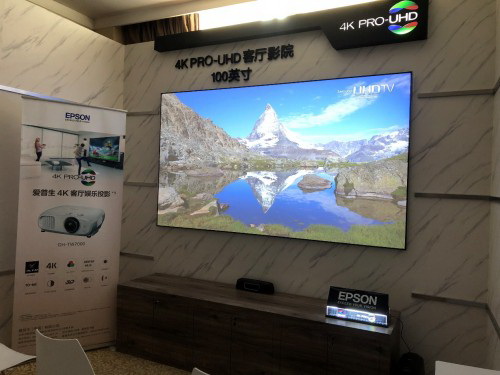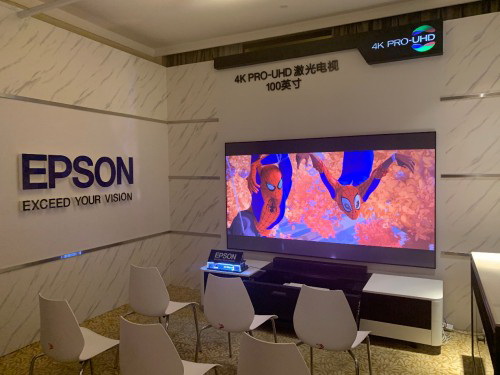 激光電視是要比投影機更能顯示出“電影感”的觀影設備,在家庭影音的表現方面更為出色,而采用4K PRO-UHD的激光電視EH-LS500系列本次也有展出。EH-LS500擁有4000流明亮度,支持HDR10和HLG,可達到2,500,000:1的動態對比度,搭配進口的DNP抗光硬幕,白天觀影絲毫不受影響。其內置智能電視系統,可以搭配使用無線投屏、AI智能語音,實現激光電視的更多家庭智慧場景的應用。