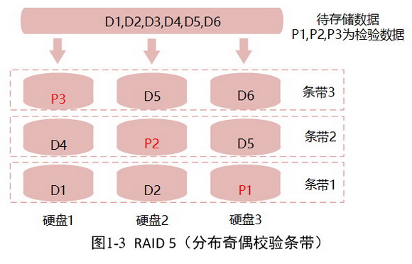 數據條帶化,校驗數據(1組)均勻分布在每個物理磁盤上。當某個物理磁盤發生故障時,可根據同一條帶的其他數據塊和對應的校驗數據來重建損壞的數據。