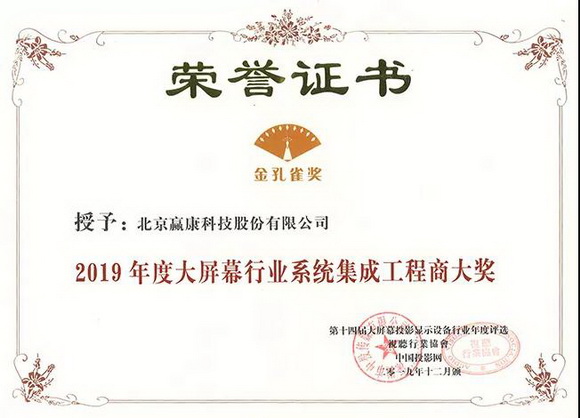 12月20日,2019視聽行業(yè)高峰論壇暨金孔雀頒獎在深圳隆重舉行,該論壇是視聽行業(yè)權(quán)威性的行業(yè)論壇。贏康憑借著2019年出色的項目工程工作,在頒獎典禮上獲得了2019年度大屏幕行業(yè)系統(tǒng)集成工程商大獎與2019年度優(yōu)秀案例大獎。