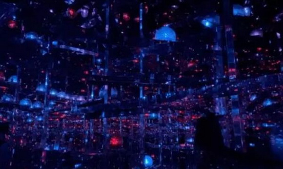 整個(gè)展館內(nèi)最為科幻的作品:無(wú)數(shù)個(gè)光束在空間中心形成了圓形的三維體,空間的鏡頭是一面鏡子,1000多臺(tái)光速燈向空間里的各個(gè)方向發(fā)出光束,令人炫目。