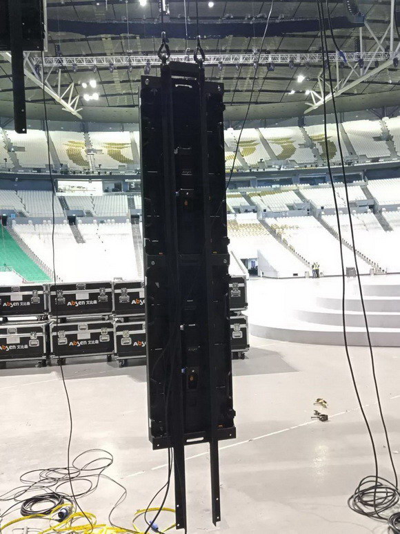 在安裝上,也充分滿足了舞臺設計需求。該屏整體面共計393㎡,采用吊裝的方式,吊裝的屏體垂直長度達到了18米,此等高度超過了平常屏體吊裝極限,而且是在采取鋼結構的方式下完成,安裝和維護都非常具有挑戰(zhàn)性。
