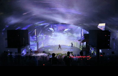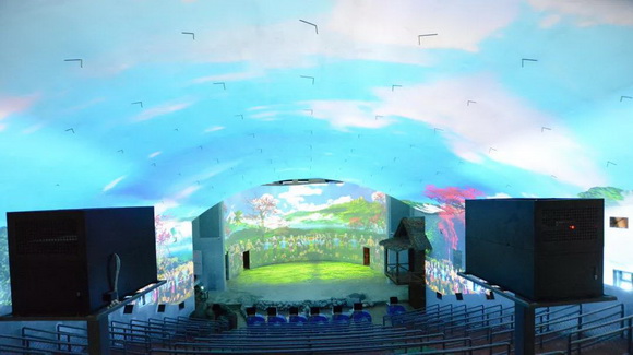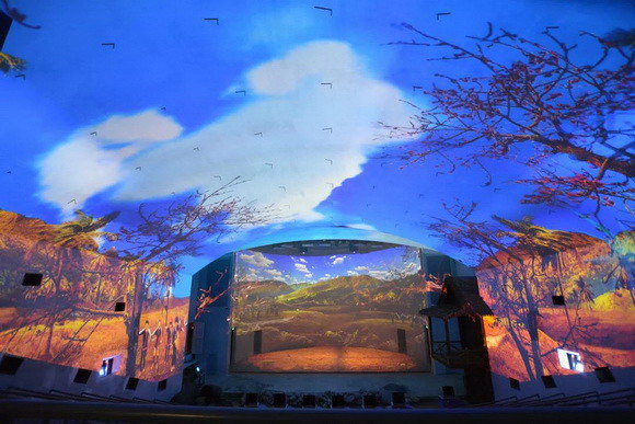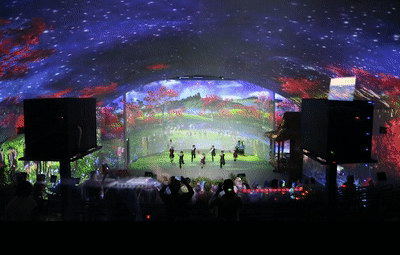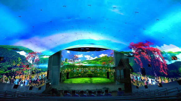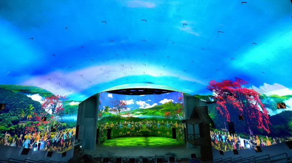 14臺(tái)投影機(jī)通過穹頂天幕投影技術(shù)、裸眼3D紗幕投影、舞臺(tái)地面投影、舞臺(tái)弧形背景投影,絢麗的燈光等設(shè)備和技術(shù)手段,展示了民族文化,推動(dòng)了旅游發(fā)展。