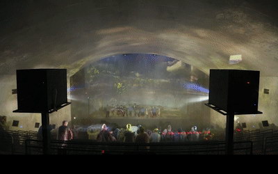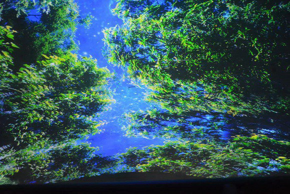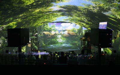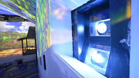 超感5D沉浸式海島臺(tái)風(fēng)體驗(yàn)館作為海南檳榔谷黎苗文化旅游區(qū)重要景點(diǎn)之一,共采用14臺(tái)NEC PA803UL+投影機(jī)(采用恒溫箱隱藏式安裝)以3D-Mapping技術(shù)、270°穹頂和全息空間成像打造。