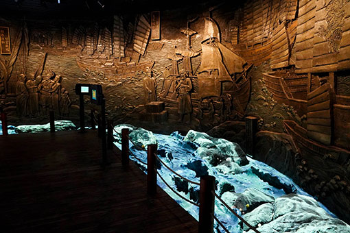 “海上絲綢之路”以AR互動的形式查看每個浮雕的內容介紹(每副浮雕代表海絲之路發展的一個時期),投影在浮雕上的水波紋,營造出海上拍浪的氛圍。安靜的石雕遇到4臺索諾克SNP-LU6600激光工程投影機瞬間變成奔騰的大海,立于石雕旁仿佛置身浩瀚的大海。