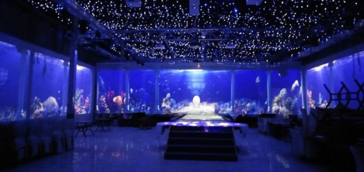 內蒙古海拉爾酒店對其宴會廳進行全新升級改造,采用全息紗幕投影、環幕投影、地面互動投影、婚紗投影多種方式,打造了一個夢幻絢麗的全息宴會廳,舉辦了一場場夢中的婚禮。置身宴會廳中 ,可以感受到夜幕降臨,無數星星流光溢彩,海豚游過,又像在海底世界,似幻似真,浪漫又夢幻。海豚游過的畫面是由全息紗幕投影打造,使用了3臺Sonnoc索諾克SNP-ELU6600投影機,一個長16米,高3.3米的紗幕上,各種獨特夢幻的畫面不斷展現,遠看像在空氣中成的像,3D立體感十分逼真。