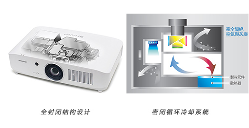 在投影機行業深耕多年的SHARP,近兩年來一直致力于防塵投影機的開發,研發出全封閉內部循環冷卻系統。