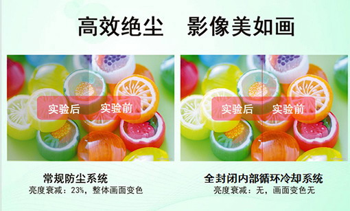 最終測試結果顯示,傳統投影機畫面色彩與亮度有明顯衰減現象,而擁有全封閉內部循環冷卻系統技術的激光投影機絲毫沒有受到影響,畫質亮麗清晰如畫。