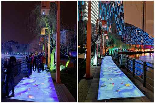 此外,另一處景色位于河堤上的一個約100米的星光大道,由10臺NEC激光工程投影機P502WL的畫面覆蓋,將雪地、鞭炮等場景畫面垂直投在錦江綠道上,市民游客走入星光大道,投影會有所感應,進行有趣互動。