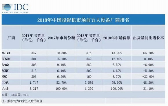2019年3月11日,全球權威市場調研機構IDC發布了《IDC 2018年第四季度中國投影機市場跟蹤報告》。數據顯示,2018年極米以57.5萬臺的出貨量位居2018年中國投影機市場出貨量第一。在2018年中國投影市場單品銷量TOP10當中極米占據4席,其中極米Z6成為2018年中國投影市場銷量最高的產品;而家用投影市場單品銷量TOP10當中極米則占據6席,極米Z6、H2、H1S包攬前三。