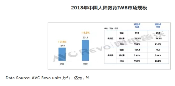 中國大陸教育IWB市場呈穩步增長,奧維睿沃(AVC Revo)調研數據顯示,2018年教育IWB市場銷量規模接近125萬臺,同比增長3.4%,銷額201億元,同比增長9.5%;銷額增速高于銷量,首先因受大尺寸化影響,其次硬件設備產品不斷精進,用戶體驗感不斷升級。
