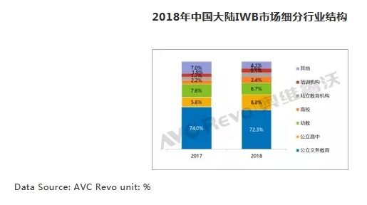 IWB產品在教育市場呈微增態勢,未來機會點應該在教育培訓市場。奧維睿沃(AVC Revo)調研數據顯示,公立義務教育占據主導,市場份額占比72.3%;公立高中份額增長最快,份額比重上升至8.8%;幼教市場份額位居第三,比重6.7%;高校、私立教育、培訓機構的份額也在不斷上升。