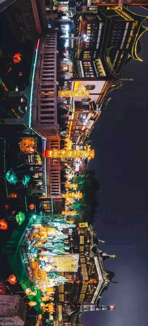 畫面可遠觀也可近賞,動態(tài)的畫面與月光映射的湖水、延伸到盡頭的九曲十八彎小橋融為一體,不同的播放內(nèi)容帶給游人不同的氛圍。