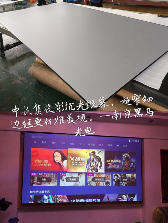 此次最新產品,中長焦投影抗光銀幕面向客戶開放,這款產品適合于單臺中長焦投影機投射畫面,顯示效果,色彩飽和度,清晰度都優于其他類正投軟幕,并且還具有一定的抗光性能。在外觀設計上,輕盈簡約的細邊框設計更符合潮流審美,無論放置家庭影院,還是單位會議室,時尚美觀的造型一定會讓用戶賞心悅目。