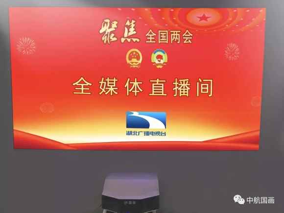 為了能夠完美地對2019年全國兩會進行實時報道,各大媒體平臺都各顯神通,不敢有絲毫的懈怠。傳統的實時報道方式已經不能滿足當下的“互聯網+”時代,融媒體全方位演播成為了本次兩會報道的一大亮點。其中,湖北廣播電視臺、長江云全媒體新聞中心大膽創新,其在北京搭建融媒體工作區,并在電視、廣播、長江云上進行融合直播。這是媒體首次使用4K超高清拍攝和制作,并使用4K高清激光投影大屏搭建全媒體直播間。中航國畫LP50US超短焦4K激光投影機憑借超清的畫質、絢麗的色彩、超大屏快速部署等優勢,助力湖北廣電打造全媒體演播室。