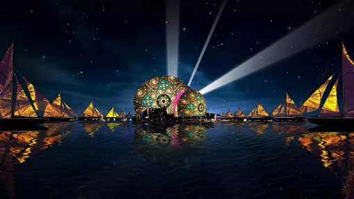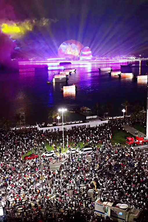 40000流明的亮度讓“貝殼”成為整場光影秀中的璀璨之星。空中俯瞰,在不計其數的激光束、燈光的映襯下,整個海島與海面船只交織在一起,形成了一副壯麗迷人的絕美景觀。