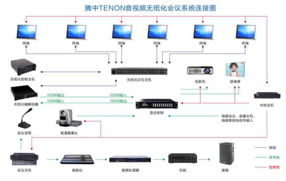 根據用戶的使用需求,本次會議室設計一套無紙化會議系統,根據會議室的布局,在會議室每個座位設計1臺液晶升降一體機,一套嵌入式會議單元,安裝無紙化軟件;同時設計一臺無紙化控制主機,作為系統的管理和控制中心,無紙化平板電腦通過無線網絡與無紙化控制主機連接,組成一套完整的智能交互式無紙化會議系統。