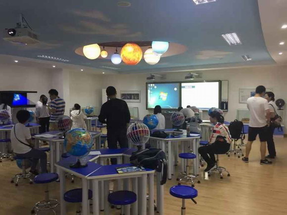 同時,教室中配備了兩塊中國、世界語音立體地形圖,配備無線點讀教鞭,電子教鞭裝有特殊攝像頭,可識別隱形底碼。配套音箱上的無線接收器收到無線教鞭發(fā)送來的碼值信息后,根據(jù)程序預先設置好的碼值與語音的對應關系,把相應的語音播放出來,對相應內容進行解說。