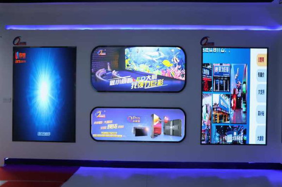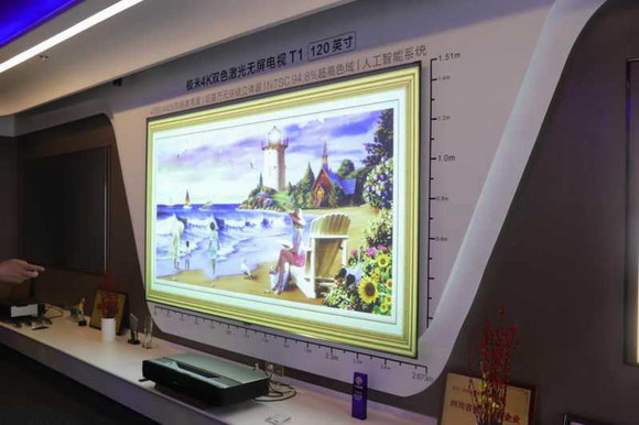 極米展廳內(nèi),可以看見,一臺(tái)120英寸極米4K雙色極光無(wú)屏電視T1以“畫框”形式展現(xiàn)在眼前,融入人工智能元素、哈曼萬(wàn)元環(huán)繞立體音等,美輪美奐的顯示效果,絲毫不弱于其他如LCD、LED顯示方式;展廳中央的無(wú)屏電視展示區(qū),各類小巧,外觀精美的無(wú)屏電視產(chǎn)品,吸引著眼球。