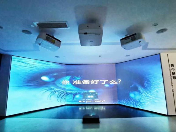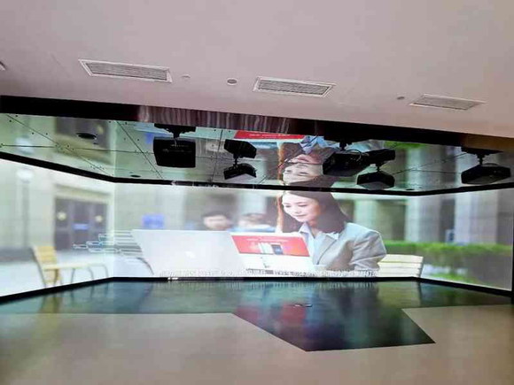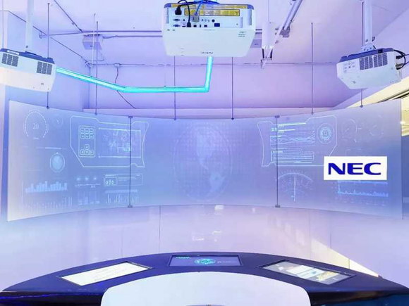 展廳共采用18臺(tái)NEC激光工程投影機(jī),重點(diǎn)打造了3個(gè)數(shù)字展項(xiàng)。其中兩個(gè)展項(xiàng)是一大一小兩套折幕顯示系統(tǒng),分別應(yīng)用了5臺(tái)NEC PA653UL+和3臺(tái)NEC PA653UL+,通過多通道融合技術(shù)實(shí)現(xiàn)超寬的顯示界面,用于播放宣傳片以及公司業(yè)務(wù)介紹。