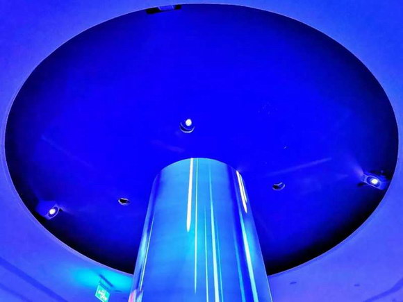 此展項(xiàng)共采用8臺(tái)NEC 5000流明的P502WL+激光工程投影機(jī),4臺(tái)投射圓柱體表面,4臺(tái)垂直投射于下方。P502WL+能任意角度旋轉(zhuǎn)并垂直縱向安裝,正好適配該展項(xiàng),方便的鏡頭位移等調(diào)試功能讓復(fù)雜的施工程序變得更加容易。