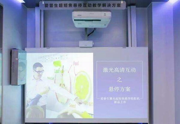 一、光超短焦互動懸停解決方案:Epson CB-710Ui激光教育超短焦投影機固定在教學白板上,投影畫面可隨白板上下移動,可以根據使用者的身高隨時調整,對小孩子來說使用更加方便,大大增強了教學互動性。
