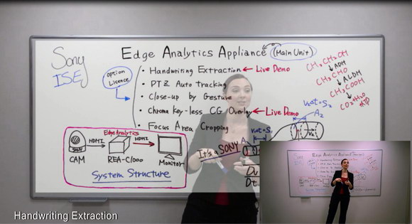 通過優化參數和處理攝像機拍攝的影像,增強分析單元REA-C1000可以使用索尼的移動對象檢測算法,從常規黑白板上提取出手寫內容成獨立透明圖層,并顯示在演講者的面前。這使得觀眾能夠清楚地看到書寫內容和圖表,同時還能看到演講者的手勢和表情。REA-C1000的這一功能不僅適合教室內的常規課程,也適合網絡遠程學習,即使學生不能與老師同處一室,也能夠如同親臨課堂般參與其中。此外,在一個安裝了次級顯示器的教室或報告廳中,它還能幫助觀眾更好觀看到現場的課程演示。