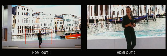 使用該功能,用戶可以快捷地從一個攝像機上拍攝的全景畫面中裁切出一個區域畫面,實現從一個攝像機上獲得兩個不同的輸出畫面的效果,用戶可以同時獲得一個4K的全景圖像和經過裁切的高清圖像。而其中的裁切區域可選擇為靜態或動態,動態時可自動跟蹤畫面中演講者的移動。(該功能將在2019年晚些時候的軟件更新中實現。)
