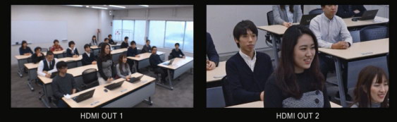 增強分析單元REA-C1000可以對全景畫面中的觀眾的姿勢進行檢測和反應,當一名觀眾站起來時,REA-C1000可以觸發攝像機操作,以電子對焦的方式自動放大此人的畫面,并同時輸出全景圖像和放大后的該觀眾的特寫圖像。在教育環境中這一功能尤其有用,它可以用于評測學生的反應,也可以用于拍攝問答互動環節。