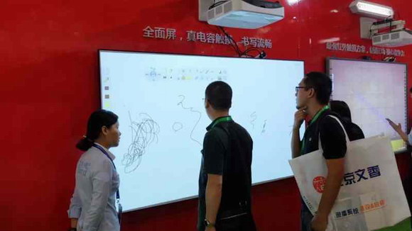 搭配純激光光源的超短焦激光投影機,色彩逼真艷麗、明亮清晰,節能環保無毒無害,使用壽命高達20000小時,不存在更換燈泡光源的問題,高效防塵,更加穩定耐用,更易于安裝、管理。通過與DrawView白板教學軟件、大小屏互動軟件等組合而成的智慧教育教學環境更是吸引現場觀眾紛紛前來體驗。