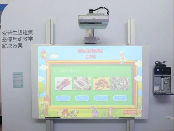 愛普生超短焦懸;顒咏虒W方案和愛普生墻面集成投影解決方案則可使畫面投影呈像更加靈活。愛普生超短焦懸;顒咏虒W方案是由超短焦互動投影機、推拉式軌道以及白板組成,可自由上下推拉屏幕。該方案不僅外觀簡潔大方,能夠營造整潔的教學環境;在授課過程中,老師和學生還可以根據自身情況隨時調整屏幕高度,更適合小學和幼兒園等學生與老師身高差異較大的教學環境,以保證學生的可視范圍,課堂互動更靈活高效。此外,該方案還支持6點手指互動+2點互動筆同步觸控,師生可以輕松地在投影屏幕上書寫文字及拖動課件。