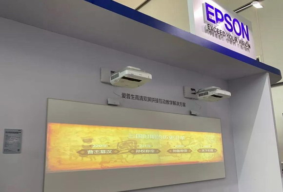 愛普生高清雙屏拼接互動教學解決方案是由兩臺CB-710Ui投影機組成,將兩個100寸超大畫面拼接,通過內置功能將兩個投影畫面合二為一,成為超寬大屏,是先進教學方案的代表之一。拼接之后的超寬屏較之一般的顯示屏幕而言,屏幕更大,投影內容更豐富,更加適用于有播放PPT、視頻等內容需求的課堂。
