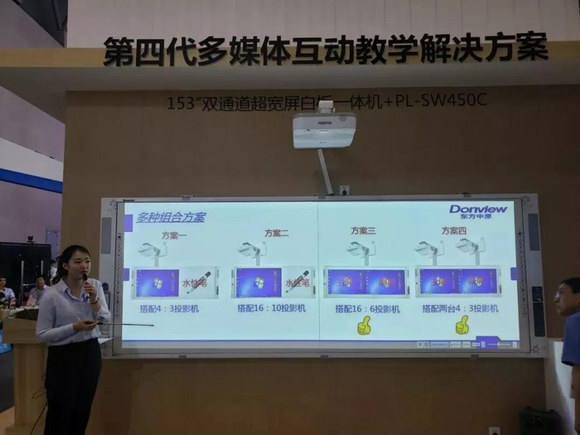本次展會,“人氣王”當屬170寸雙通道電容白板一體機,它是東方中原自主研發的全球最大雙通道電容白板一體機解決方案,擁有超大尺寸的屏幕同時不失細膩精致,將先進電容觸控技術與電子白板結合,使得各項技術優勢都能在大尺寸上充分發揮,遠高于紅外觸控效果。除此之外,Donview東方中原還帶來了86″電容一體機以及集合了教育、云端、顯示、交互四位一體的智慧班牌等。在多種尺寸的優勢下,東方中原為教育行業提供了眾多可選的系統性解決方案,可根據不同的場景需求實現輕松便捷的應用和管理。不僅滿足了當下及未來教育用戶的使用需求,同時也為師生帶來了領先的技術體驗,為互動課堂增添了無限樂趣,也充分展示了東方中原白板一體機在應用和交互式教學領域的技術實力。
