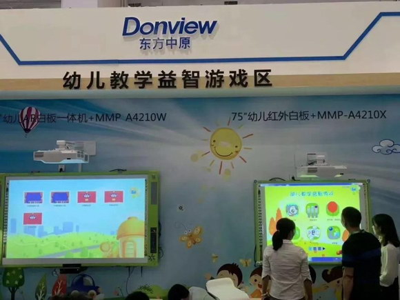 除了關注基礎教育、高等教育,東方中原也相當重視幼兒教育。在未來幼兒教室解決方案體驗區,東方中原展示了可實現前維護的101寸AR白板一體機、75寸幼兒白板一體機。它們采用紅外觸摸技術,無需專用筆操作,納米鋼板材料的面板設計保證了書寫的流暢,且抗光性能好,同時防水防塵,且支持手勢擦除,可手勢識別,具備免驅動、免校正、定位精度高、反應靈敏等眾多特點,并配有幼兒教學益智游戲盒,能夠完全滿足幼教用戶的需求。