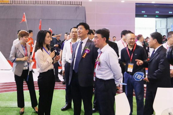 ▲廣西教育裝備行業(yè)協(xié)會會長陳鐵華等一行蒞臨銳取展位參觀指導(dǎo)