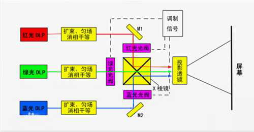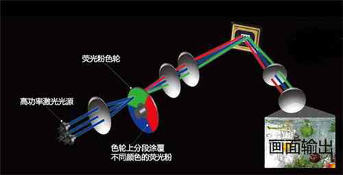 提到激光電視,那么就不得不提到激光投影。激光投影使用具有較高功率(瓦級)的紅、綠、藍(lán)(三基色)單色激光器為光源,混合成全彩色,利用多種方法實(shí)現(xiàn)行和場的掃描,當(dāng)掃描速度高于所成像的臨界閃爍頻率,就可以滿足人眼“視覺殘留”的要求,人眼就可清晰觀察。