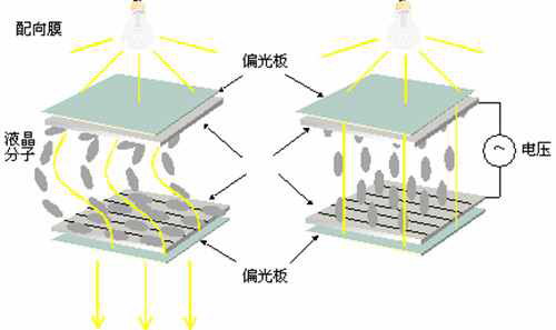 在兩片玻璃基板上裝有配向膜,所以液晶會沿著溝槽配向,由于玻璃基板配向膜溝槽偏離90度,所以液晶分子成為扭轉(zhuǎn)型,當(dāng)玻璃基板沒有加入電場時,光線透過偏光板跟著液晶做90度扭轉(zhuǎn),通過下方偏光板,液晶面板顯示白色;當(dāng)玻璃基板加入電場時,液晶分子產(chǎn)生配列變化,光線通過液晶分子空隙維持原方向,被下方偏光板遮蔽,光線被吸收無法透出,液晶面板顯示黑色。液晶顯示器便是根據(jù)此電壓有無,使面板達(dá)到顯示效果。