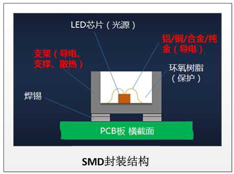 支架:導電,支撐和散熱,多為支架素材經過電鍍而形成,由里到外是素材、銅、鎳、銅、銀這五層所組成。