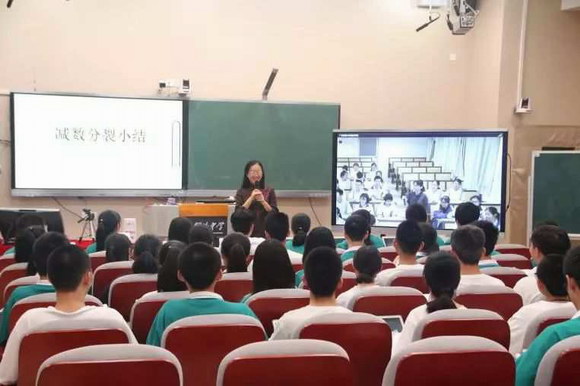 作為發布會的重磅環節之一,5G+互動課堂公開課展示了5G環境下雙校區直播聽課與互動的課堂模式。通過希沃交互智能錄播系統與希沃易課堂,廣東實驗中學高中校區與遠端的越秀校區進行實時連線,由陳玲老師為雙校區同步講授生物課程《減數分裂小結》。